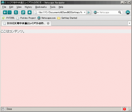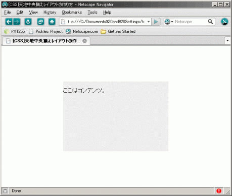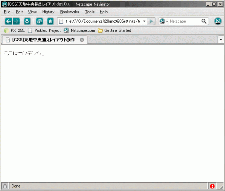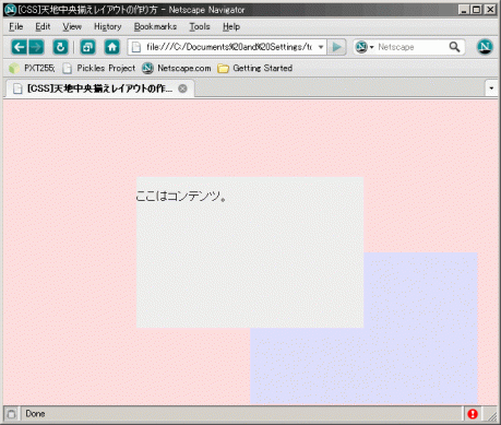 このときの #content の top:50%; と left:50%; は、親要素である #outline_dummy の大きさ(つまり300*200px)が基準になることがポイント。この手順によって、 #content は親要素の大きさの半分だけ左上方向に戻ることになり、結果としてウィンドウの天地水平中央に配置されることになる。