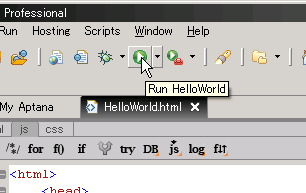 とりあえず、画面上部の「Run」ボタンを押したら、プロジェクト HelloWorld をプレビューできた。