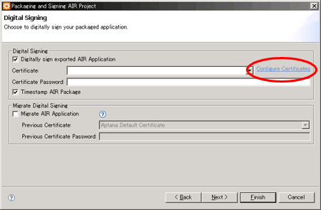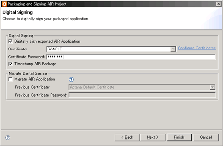 「Digital Signing」の意味はいまいちわかんないけど(汗)、多分、デジタル署名とかの意味合いで、作者が誰なのか示すために使う機能ではないかと思う。次の手順で一応 *.air の形式に出力できた。