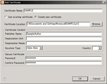そしたら、「Add」して、AIR Certificates を作り、次のような感じで、穴を埋める。