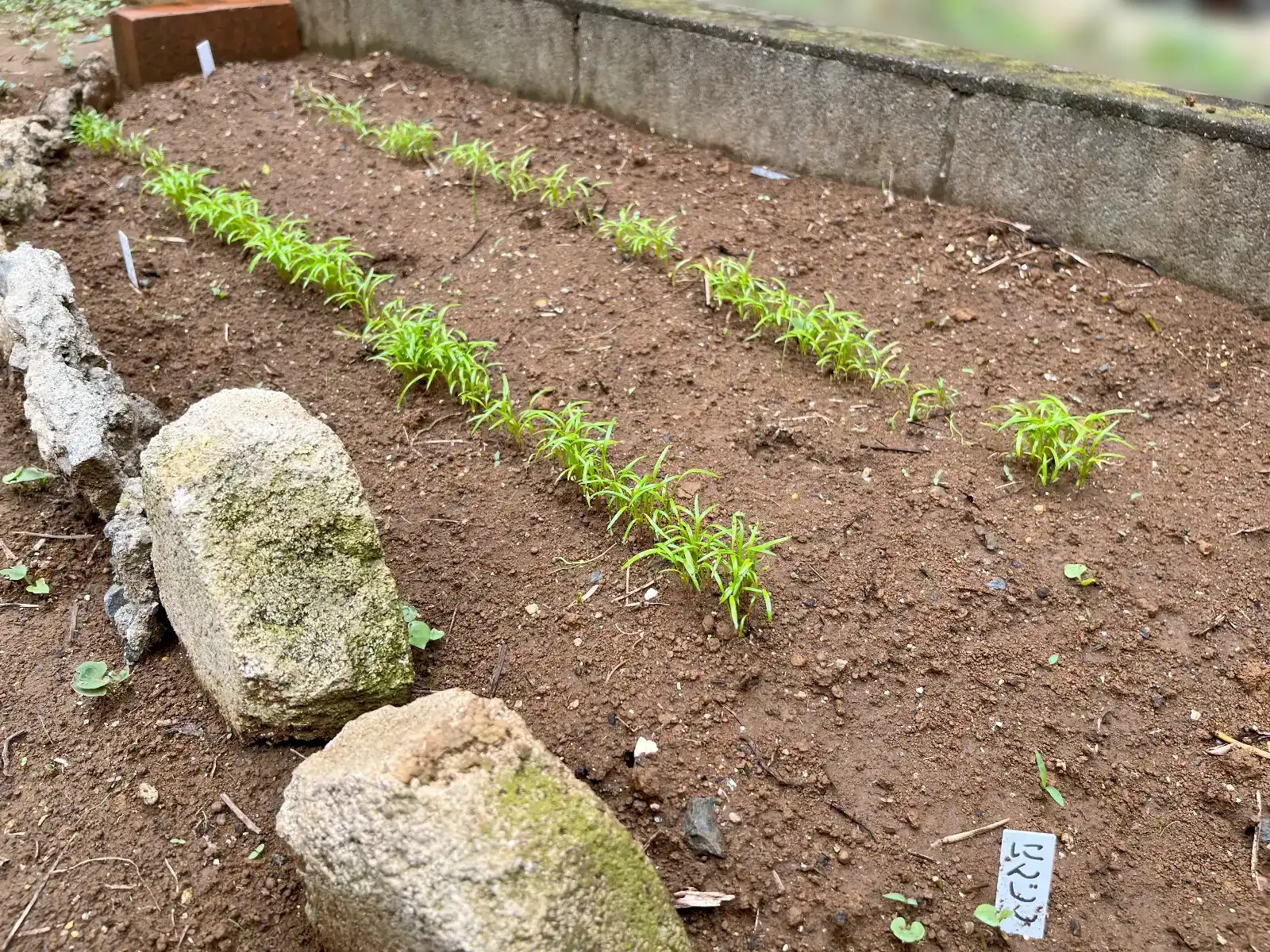 本当は、ある程度生えてきたら密集しているところは間引いたほうがいいらしいのですが、コンセプトが ユートピア で 永久機関 で 不労不死 なので、なるべく人の手を加えることなく、だまって見守ります。強く生きろよ。