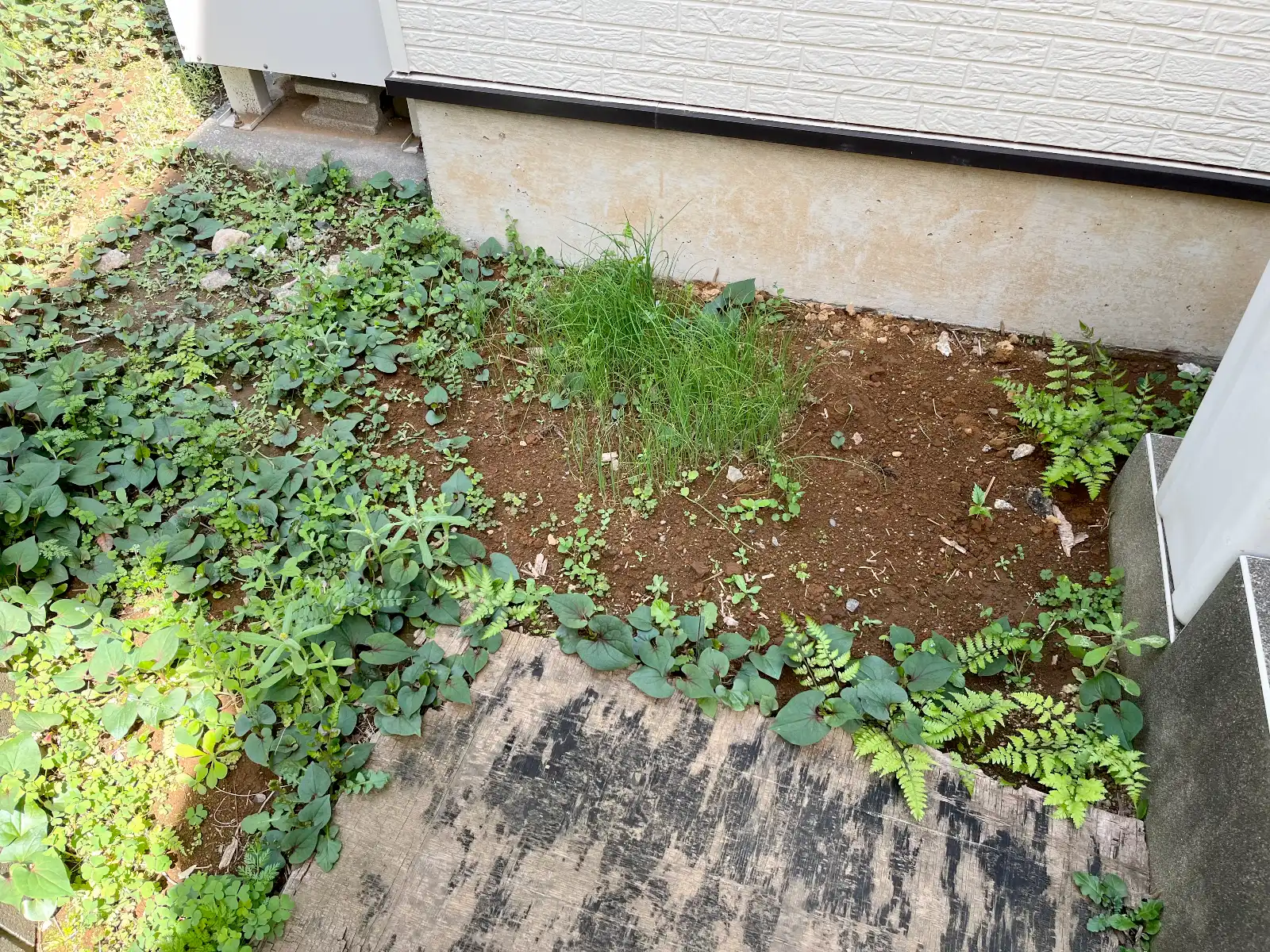 ここには意味のあるものは何も置かれていなくて、おそらく家が建った当時からずっとそのままだろう土が剥き出しになったままで放置されており、どこからか飛んできたのだろう雑草の種が芽吹いて根を張り巡らし、抜いても抜いてもアッという間に草ボーボーになるエリアでした。
