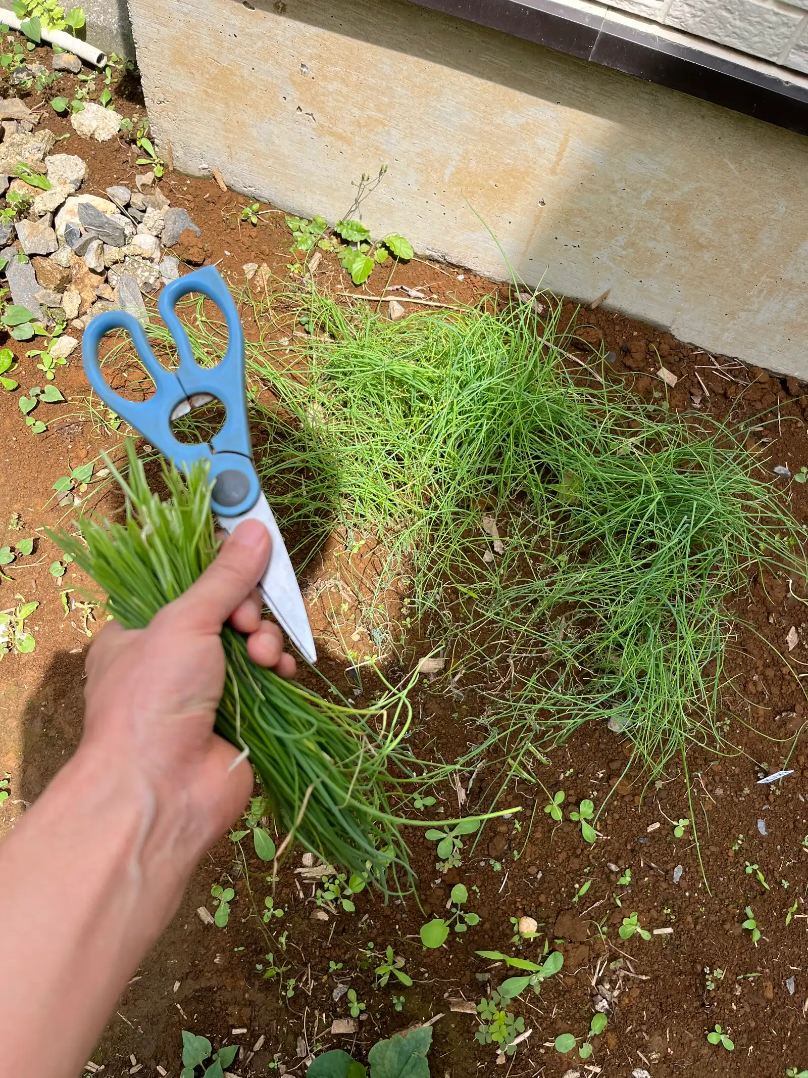 コンセプトが ユートピア で 永久機関 で 不労不死 なので、そのまま放っておいたら最後はどうなるか見てみたいという好奇心もありましたが、ハサミで切って収穫すると、切った口から次のネギが生えてくると聞いたので、収穫してみることに。