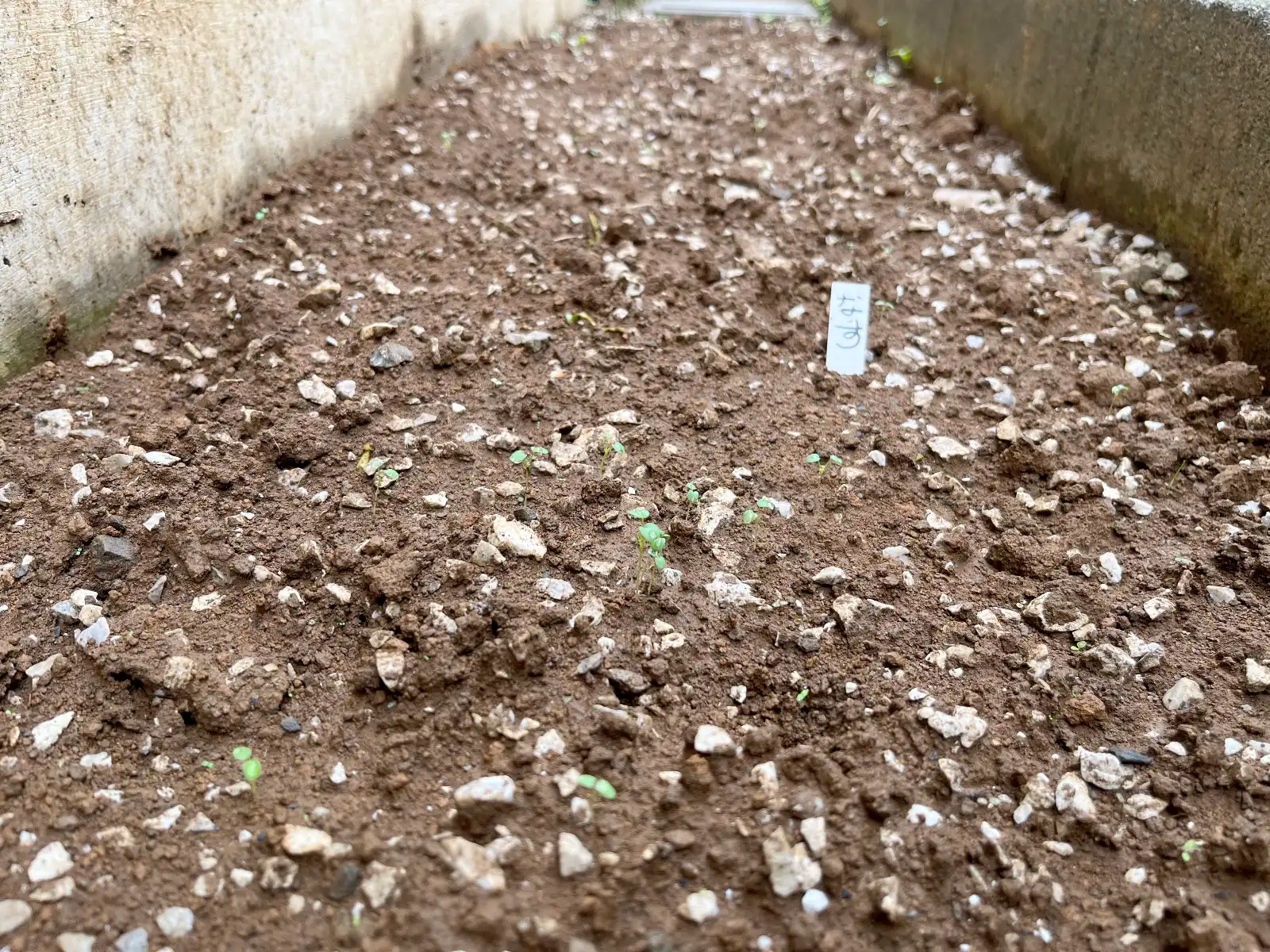 ナスは遅いみたい。ニンジンと同じ時期の写真ですが、まだ本当にナスなのか疑わしい小さい芽が見える程度です。