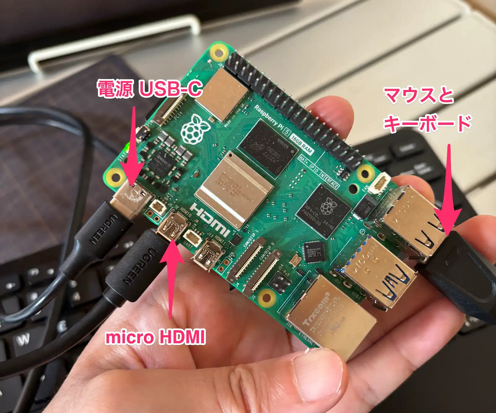 OSの準備ができたので、ケーブル等を接続して、Raspberry Pi 5 を起動してみます。
