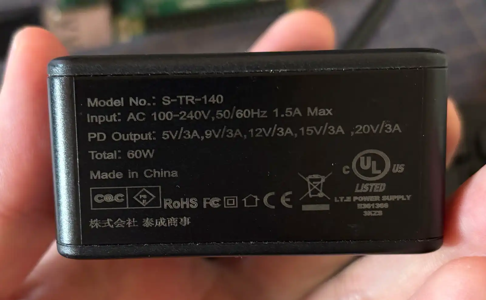 Raspberry Pi 5 は 5V/5A = 25W の電力を必要としますが、このアダプタは 5V/3A なので、少し足りません。足りないけど使えました。