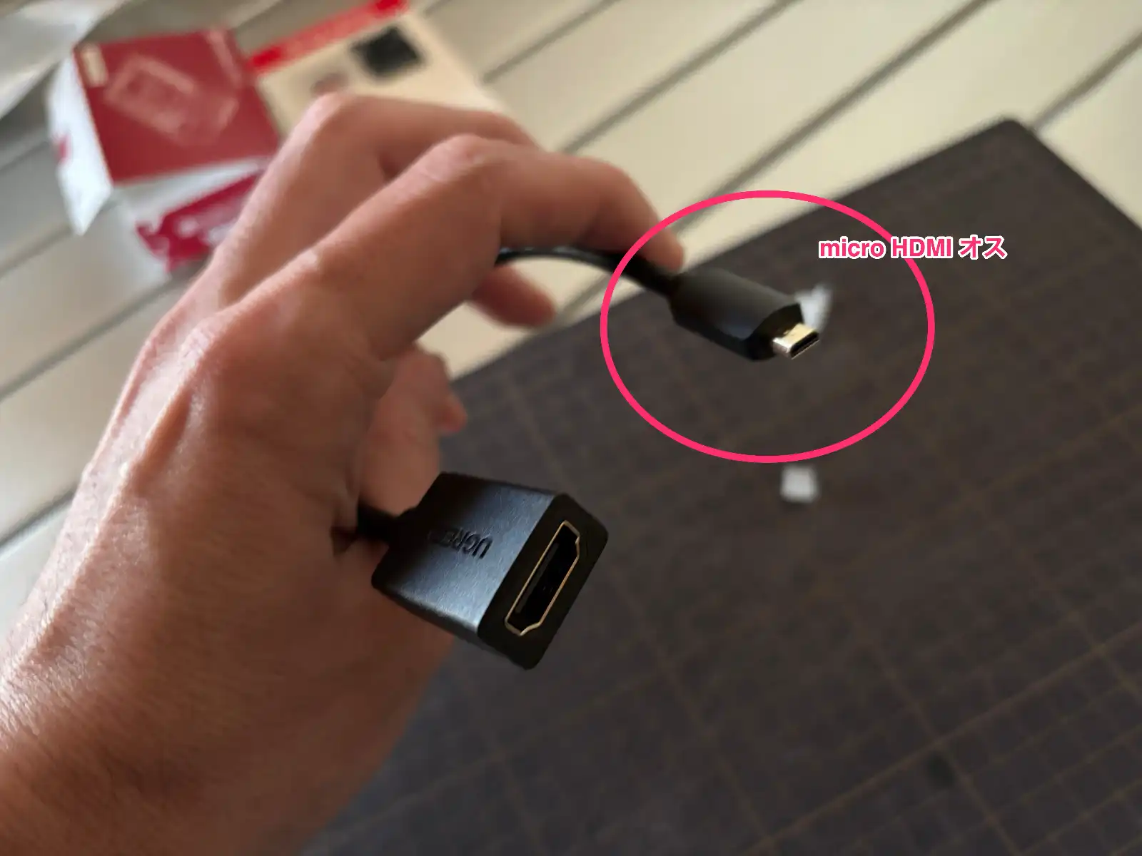 Raspberry Pi には、 micro HDMI の穴が2つあいていますので、一方が micro HDMI オス になっているケーブルを用意する必要があります。