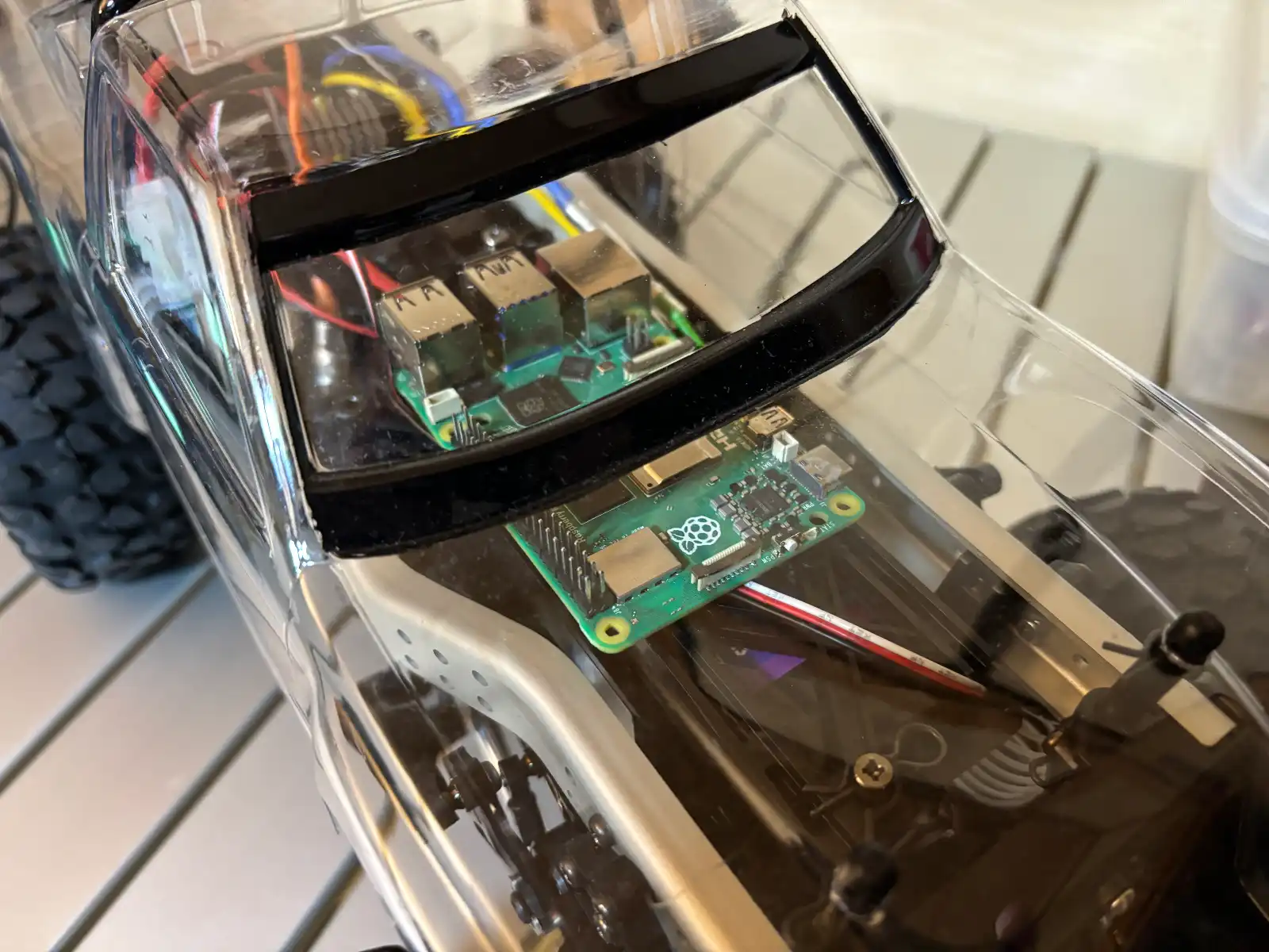 1/10サイズのラジコンだけど、これが想像してたよりだいぶ大きく、Raspberry Pi は想像してたよりだいぶ小さくて、載せてみたら余裕ですっぽり収まった。