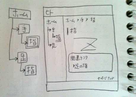 『/手/指』 と 『/足/指』 は同一のURLを持つ同一のページでありながら、サイトマップ上複数存在することになる。ということは、パンくずを複数持つということでもある。