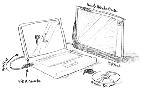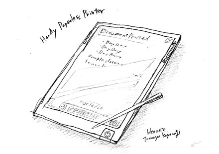 ハンディペーパーレスプリンタ案では、単純に「擬似プリンタである」というスタンスを取り、一時的に印刷したい長文メールや作りかけの企画書などの、「読んだらすぐ捨てられる日常的印刷物」を削減するためだけに使うものとして想定している。