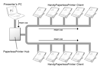 プレゼンターは、配布資料のデジタルデータを自身のノートPCに入れて会議室に持ち込み、プリンタハブをUSBで接続する。この会議室には、プリンタハブから10本のケーブルが各席に伸びており、ハブに対してプリントキューを送信すると、10本のケーブルの先全てに対して印刷データが送信されるという仕組みだ。